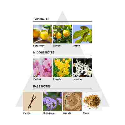 香り:トップノートはベルガモットとレモンが爽やかに香り立ち、グリーンのアクセントが加わることで心を軽やかにします。ミドルノートではオーキッド、フリージア、ジャスミンが花々の豊かさを演出し、最後にバニラやウッディ、ムスクが柔らかく包み込みます。